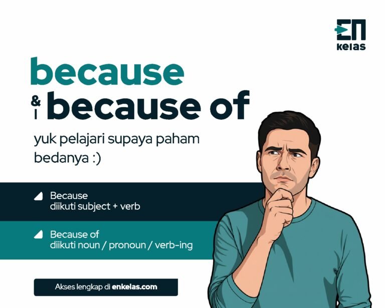 EN Kelas – Belajar bahasa Inggris itu kadang bikin kita garuk kepala sendiri. Ada kata-kata yang artinya sama dalam bahasa Indonesia, tapi ternyata cara pakainya beda banget. Nah, contohnya adalah because dan because of. Dua-duanya berarti “karena”, tapi jangan sampai terkecoh ya, karena aturan penggunaannya nggak bisa ditukar seenaknya. Kalau salah pakai, kalimat bisa jadi nggak nyambung atau malah terdengar aneh. Jadi, yuk kita bahas dengan gaya santai biar gampang dipahami dan bisa langsung dipraktikkan.